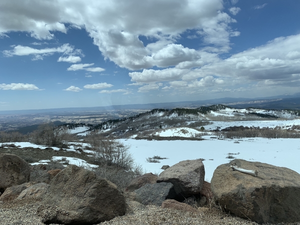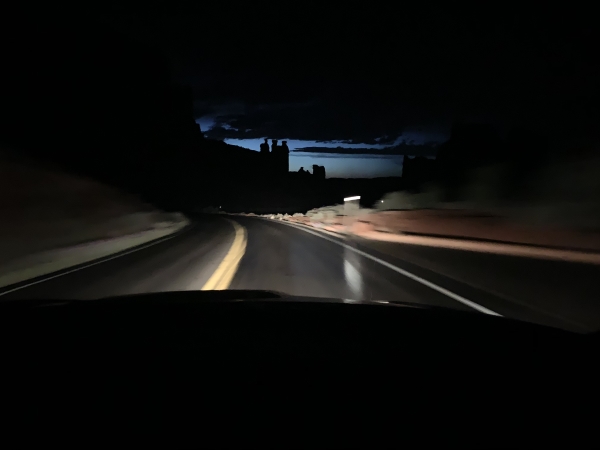 After two nights in Bryce, we drove to Arches National Park, which basically took all day. We went through a bunch of wild landscape, up over a snowy pass…