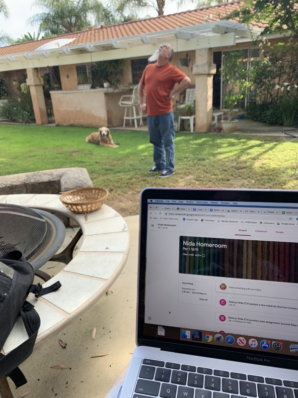 Here’s my guy (not my dad) looking for UFOs after throwing the ball a thousand times for Calli while I was grading…
