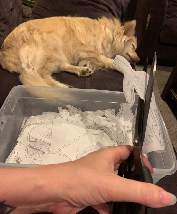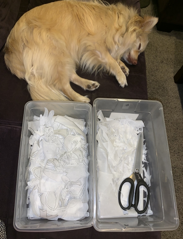 As you can see, Simba was very invested in my finishing. Which I did. It took 4 1/2 hours to cut them all out. Not bad. Sorting tonight? I hope. Then clean up the studio for the next round of picking fabrics…one of my favorite parts. I’m looking forward to that bit. I’m really looking forward to 57 days off. Well. There’s 10 days I won’t have off of work. But I’m getting paid for it and it’s for a good thing, so that’s OK. I might not think that when I’m having to get up early next week, but for now, it seems OK.
