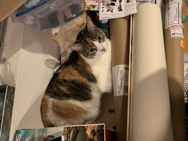 Effective organization has to be one of the biggest challenges to a creative person. My big worktable looks just like yours – covered in stuff with a cat in the middle. I say move the bookcase out of the room to any flat wall where you can still edge around it. Then you can pile stuff where it used to be. My uninvited 2 cents worth.
