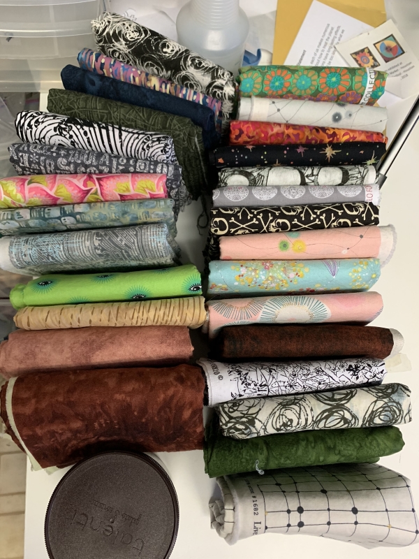 I tried for some real variety, although some are obvious fillers to the stash. The one on the bottom left is the binding. There are three others in there that were possible bindings but got rejected…the green on the almost bottom right, the darker reddish brown three fabrics above it, and the dark blue that is three down from the top left. The other one won out.