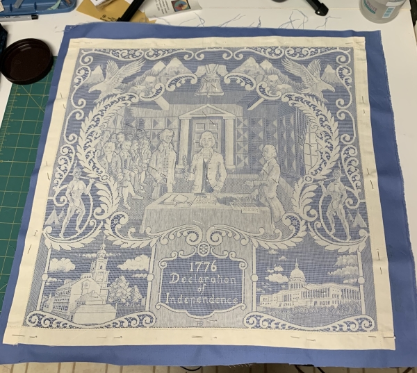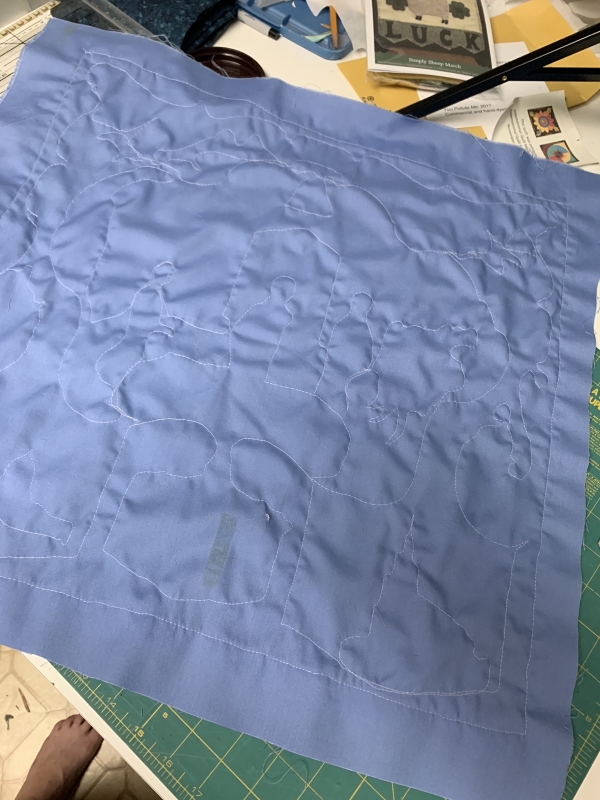 I ironed it after this. Now it’s ready to stitch. I don’t think I can transfer letters onto it, though. I could write on tracing paper and pin that on and stitch over it and then pull out the paper, but that sounds like a pain in the ass. Sigh. Not sure. I will need to figure that out before 1 PM today, I think. Maybe.