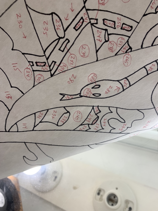 So I was tracing and it was midnight and I’m realizing that I got to piece 323, and I’m looking for 324, and I’m realizing there’s a whole ‘nother set of pieces that’s got the same numbers as what I was just tracing. Seriously? I double numbered 280-323. There’s two pieces numbered 280…two pieces numbered 281. Ah sheet. So the second set all get ‘a’ after them. Plus this thing has 43 more pieces than I thought it did. So much for brain power, eh? Not sure how I did that. But I did.