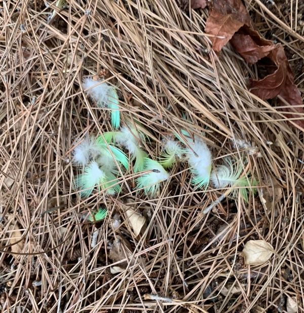 So my pool guy just took a leave of absence for a family emergency (his words), but no insight as to how long…just a phone number for referrals. I used to take care of the pool myself…but it’s a pain in the butt and a difficult chemical pool anyway, so I hired someone. He’s not the best, but he’s been doing it a while. Last night, I went out there and cleared out a bunch of pine needles (need to do it again today), and found these feathers…