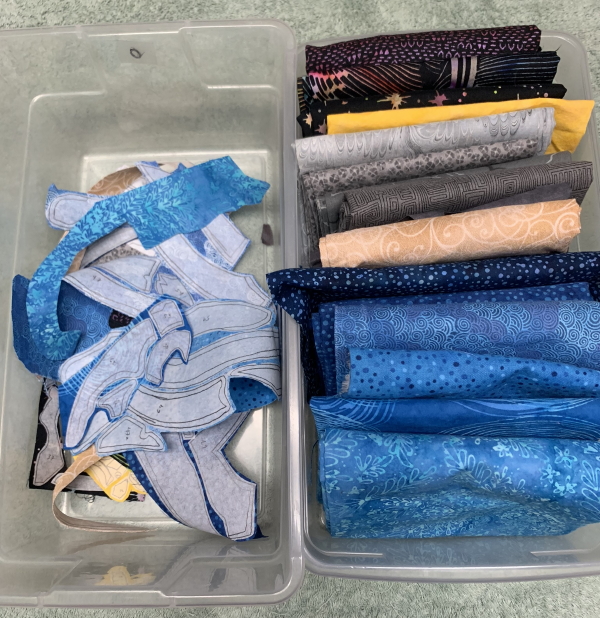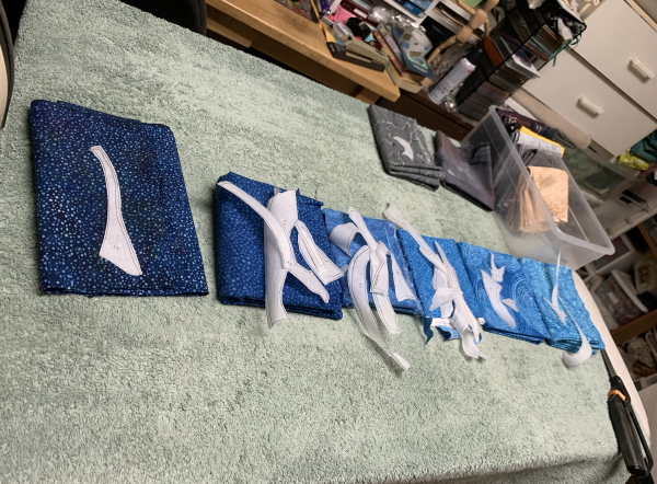It should take me about 10 hours to iron all these down, maybe more. Here’s the set up. I did put all the loose fabrics away before I started. I hang the drawing up so I can see it.
