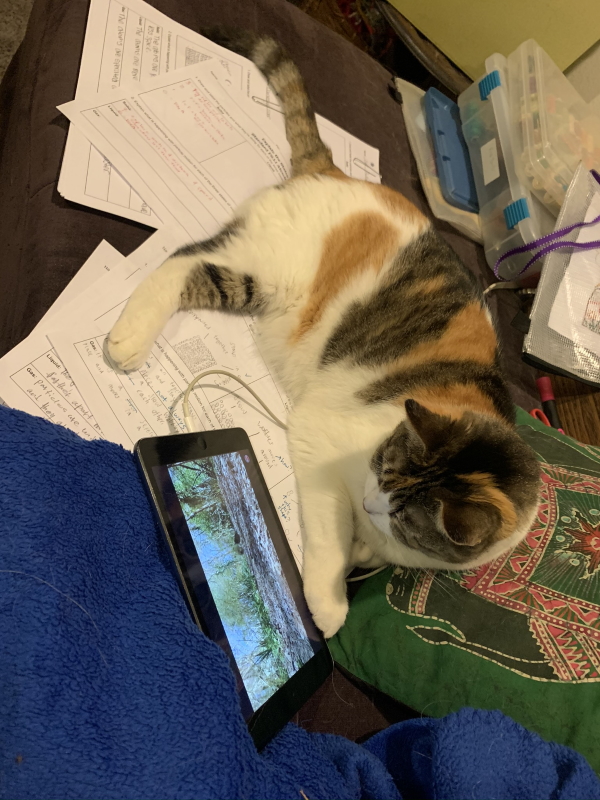 Lecture aside. For now. I won’t have a voice for it in class. I gave a quiz yesterday. I graded it last night. All of them. 160 or so. Good stuff. Still behind on grading other stuff, but I’ll get there. While I was grading, Kitten kept sitting on all the papers…so I turned on Cat TV for her.