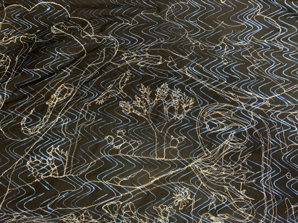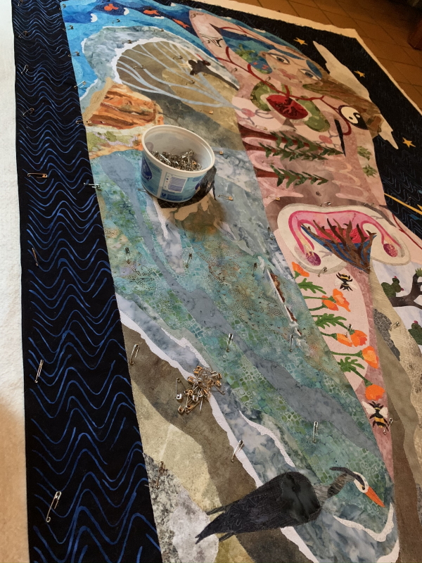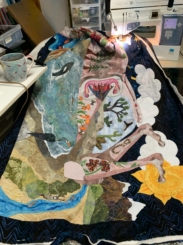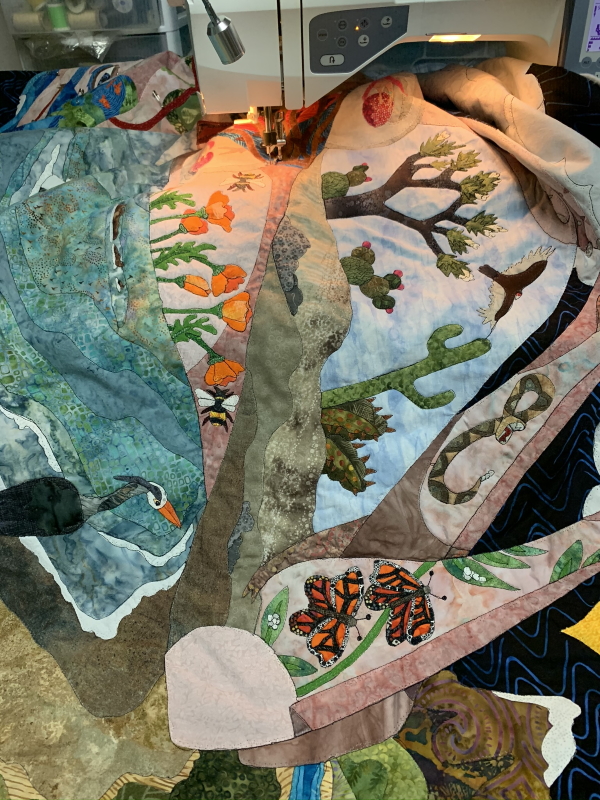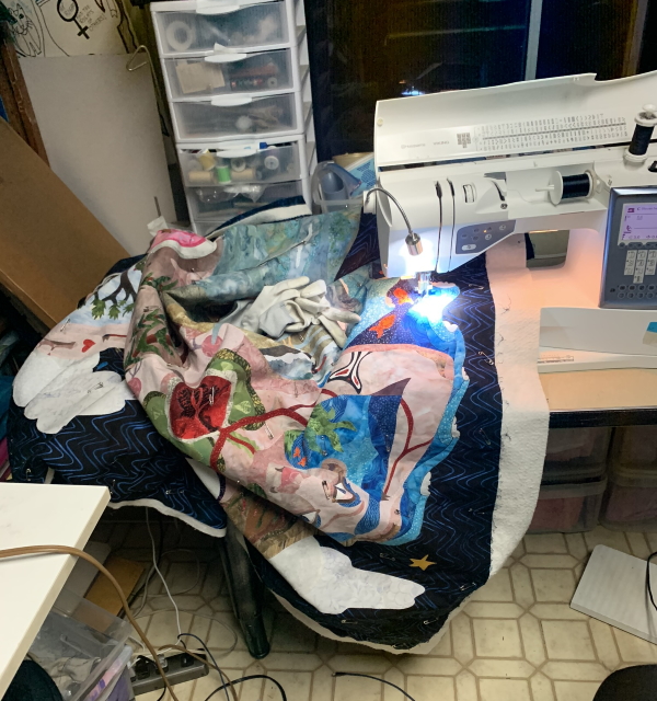 I have the whole torso, most of one arm and all of another, plus Anza Borrego and her head. Then I have to quilt the background. Hmm. Plus a 2-hour staff meeting and I’m cooking dinner tonight. Sounds problematic. OK, finish the outlining tonight. Finish the background tomorrow night and trim it, cut the binding. Maybe put the binding on? Shit. Time. When the hell am I going to grade anything? I guess it’s a good thing I have absolutely no evening plans this week. I did record some different videos for my Patreon this weekend…a bunch of me singing along to music as I quilt (not so interesting) and then a short treatise on materials and why you should wash your Machingers more often than I do. It’s not hard. I just buy new ones.