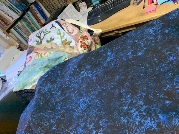 Then I went through the stash to find something for the backing. This is a batik on the front, and I used the whole width from selvedge to selvedge, so I knew I’d have to use another batik on the back, unless I wanted to piece it (I did not)…because batiks run about 44″ wide and regular fabrics are usually only 40-41″ wide. I didn’t want to lose the 3″. So I grabbed something that might work as a background, but was being conscripted to backing today.
