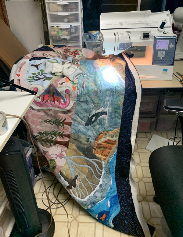 It’s not like this is hard. As long as the sewing machine behaves (sometimes an issue), this is easy. I put on some loud music, I try to remember to stand up occasionally, I forget to eat…and I stitch. At 4 hours and 51 minutes, I was done.