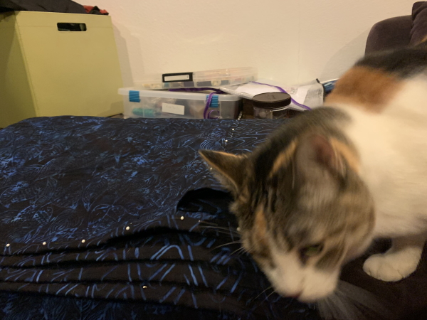 Same stuff as the background. I bought just enough to do the sleeves. Note to self…when your quilt is WIDER than it is TALL, your sleeves will be really long. Ugh. I have to sew all those down. Damn. Well. You learn something new every time you do this. Yeah, this cat is blurry. I kept trying to take pictures of her rubbing her head and body all over this quilt (sheesh), and she was moving too much. The Instagram one is the only non-blurry one.