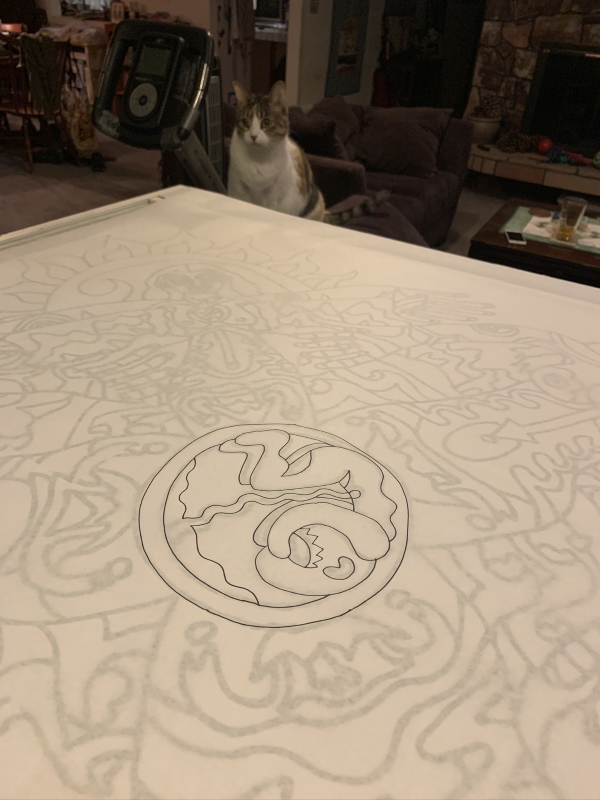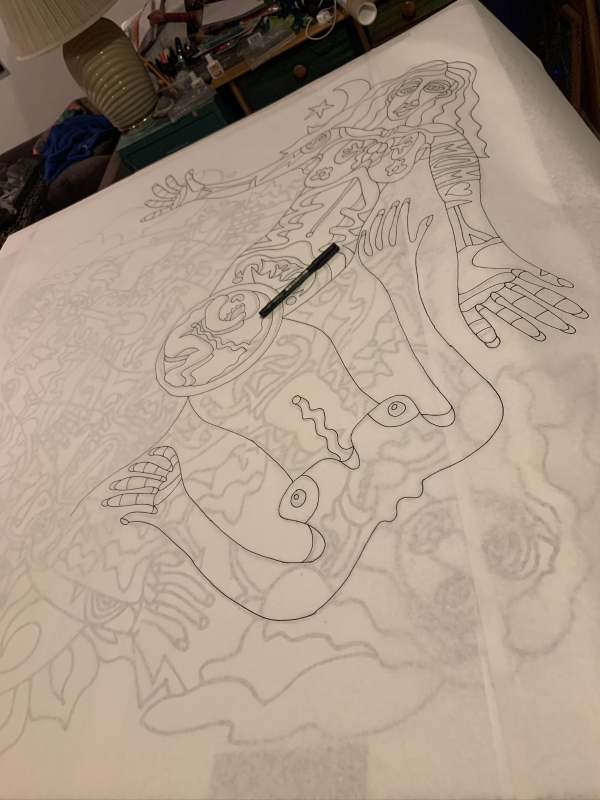 So I’m not changing much…but the lines after being enlarged to 500% are really thick and it’s hard to tell what’s happening in some places, so I am redrawing, adding and changing a few things (you can see I changed the umbilical cord where it hits the inside of the uterus, adding a placental area. I also gave that baby eyelashes.), but also clarifying where all the lines are. If you’re trying to trace pieces and the line is a 1/4″ thick, there can be a lot of variance in the overlap. I’d rather not have that.