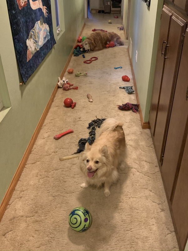 While Katie was here, we had to hide all the toys from her. She destroys them. The boychild dumped them all back in the hallway yesterday…
