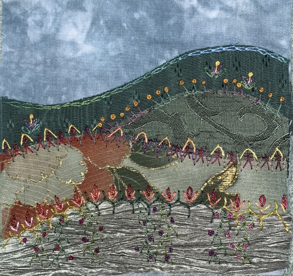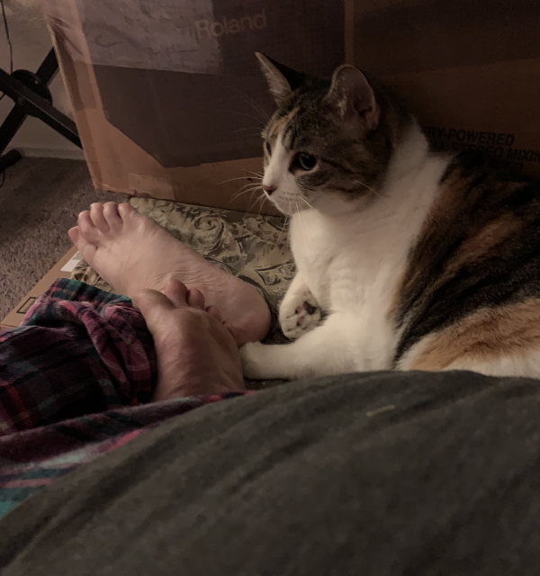 I didn’t do any art last night…well, not my own art. I wrote instructions and ironed a bunch of Wonder Under to fancy fabrics in preparation for today. At the end of that, it was well after 11 PM and I sat with the cat and a dog and tried to still my brain.