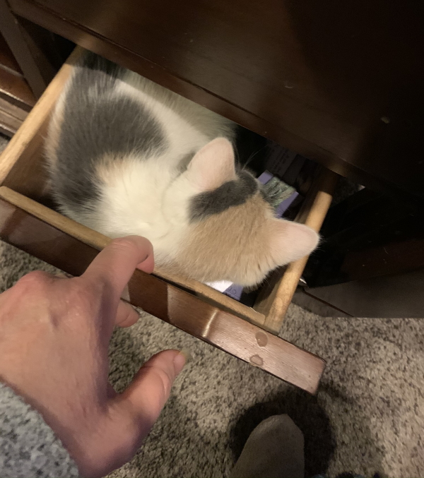 We lost kittens a few times yesterday. They climbed into the drawers from under the table.