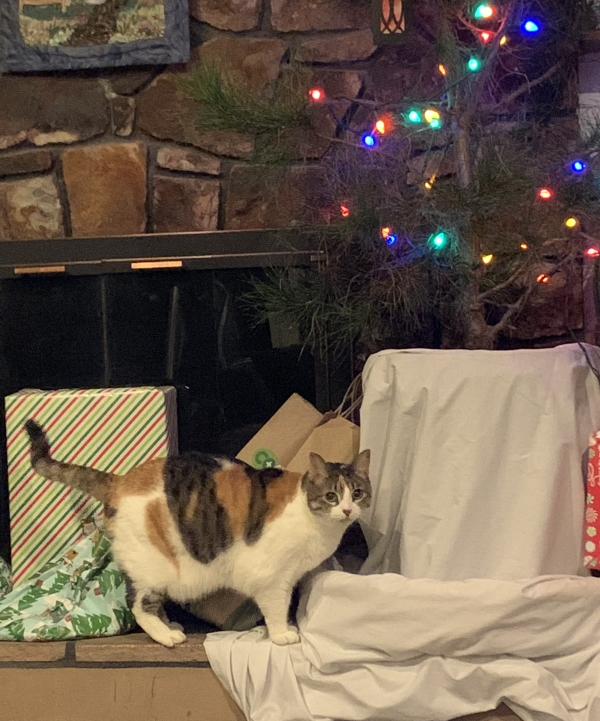 The kittens went off to their spay surgery location last night…spay today; we’ll see them on Sunday night (well, the man will see them tomorrow night). Apparently one really didn’t want to get in the cage at the foster location. Awww. We are no longer fostering by the way…they’re ours. Because they were gone, though, Kitten came out to explore her favorite thing this time of year, the Christmas tree. Yes, it only has one ornament on it. I’ve been busy.