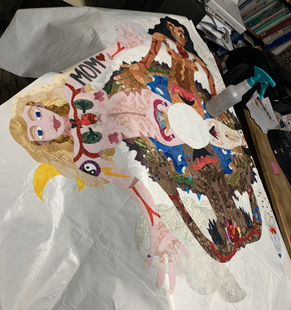 And the center bit…and I laid out all the 800s…but to keep ironing would have put me well past 1 AM, so I stopped at midnight. Ish. Sleep is a thing I need. So I have a head to do, the center bit, and the space cat, about 72 pieces. Then I need to figure out the background, which is a bigger deal. Because I have no idea what I’m going to do about that. Maybe give up and go shopping on Thursday after work. I wanted to piece this background and this was going to be the perfect piece for that, and it might still be, but I haven’t had the time to see if I can pull it off. Too much time being responsible and shit.