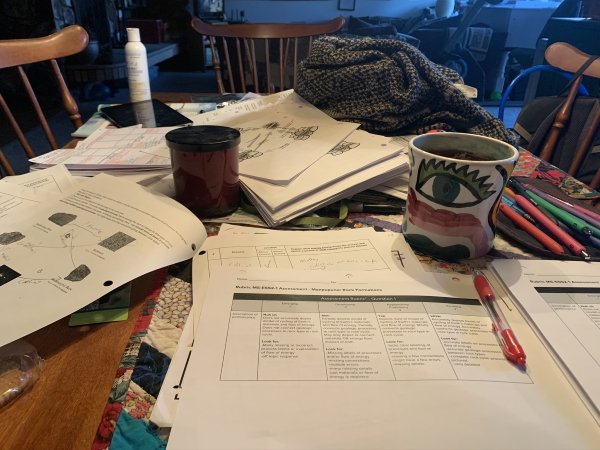 Sometimes I sit on the couch and do it while watching TV; sometimes I sit here. It doesn’t help. I have to get up regularly and do something else. I can’t grade less right now. These are assessments. They require me to pay attention and focus on real answers and feedback. I can’t just throw them out. This is where I realize that I didn’t teach the kids some things, or even that I DID teach them and they didn’t retain it. It’s frustrating. But it has to be done. And it’s time-consuming. There’s no real way to figure out what they know with a multiple-choice test. There’s three different ways for them to show me here. And some got perfect scores. Some didn’t.