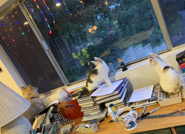 Honestly, none of us know why he barks so much or what he’s barking at. After the dogs left, we had all three cats playing with one purple ribbon…