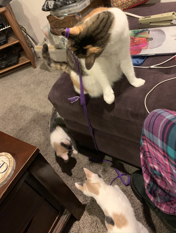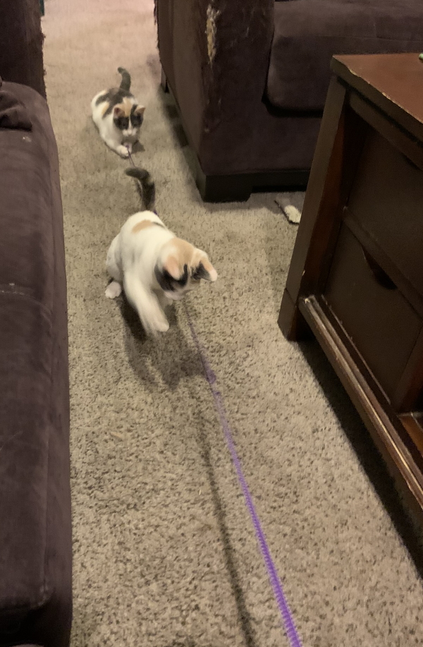 She seriously pounced on it. Kitten is still the biggest…but there was some racing around the house by all three…