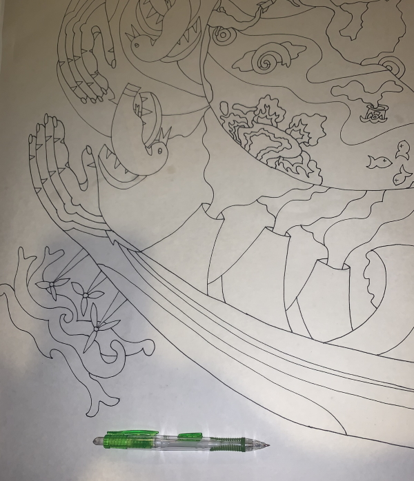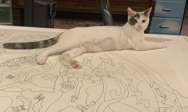 She is doing her cat duty by lying on what I’m working on. Seriously. That’s where I needed to be drawing. But this quilt is more about climate change and war than cats, so I left the cat out.