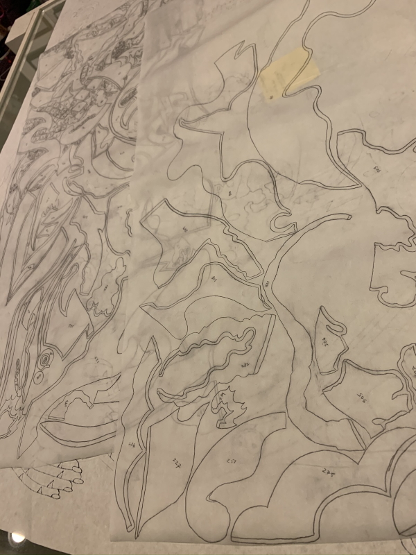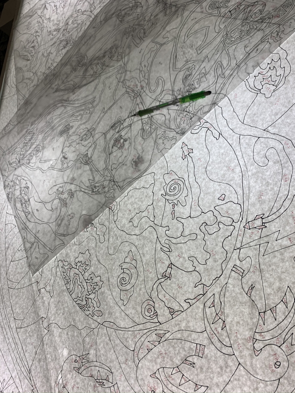 I’m in the 300s, I’ve mostly filled one yard and am well on the way to filling the second one. That’s about 5 1/2 hours…not super fast this time. I’ve done almost all of the background stuff, so next on to the body. My goal this week is to finish tracing this and start prepping the fancy paper I bought for the book I’m going to build/draw. If I’m smart, I’ll make a prototype first. It’s debatable if I’m that smart…that shit takes time I don’t usually have.