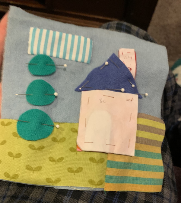 After all that, and some food and reading, I worked on the braindead stuff…just stitch things down…except I already fucked one thing up. Oh well. The stripes on the bottom were supposed to go vertical. Not the end of the world. This is Sue Spargo’s Homegrown block-of-the-month. I was trying to decide what to take on our Spring Break trip, and Folk Tails (or is it Tales) is too big right now for that, so I was going through my stash and started a bunch at a time.