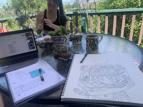 I did meetings 3 and 4 outside…it was warm, but not too warm. I drew during the staff meeting because it was pretty repetitive. I stopped during the village meeting, because it was not repetitive and I had to do the things. On the screen. With the stuff. I wasn’t really trying for a message in this drawing…just drawing. I need to do a Patreon drawing by the weekend, but it should be smaller than this. Maybe later today. Girlchild is studying and listening to the official crap from my computer, dogs on the deck beside us. Not bad. Could be worse.