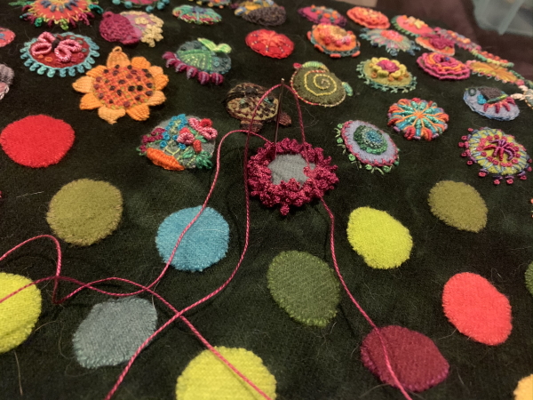 I put a pillow on my lap, so I could stop stabbing the needle into my leg for the drizzle stitches…all 70 million of them. Top left…