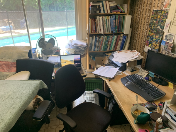 Tonight. Tonight I will iron. I hope. I have an extra Zoom today, I still need to eat lunch, and I’m walking between Zoom 2 and 3. Because I need to and it makes me feel better. This is my view on so many days…it’s usually the coolest room and I have access to two computers at a time.