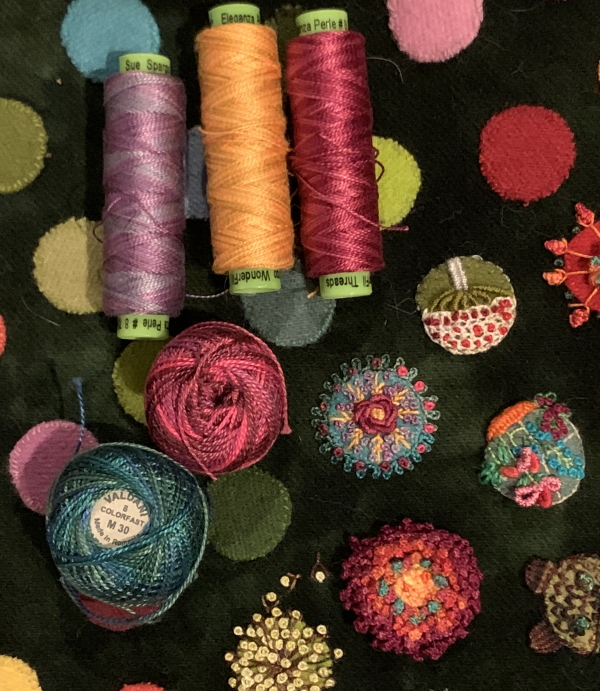 I didn’t do anything after that except be tired. I did stitch on some dots…this was Friday night’s…the one under the green spool.
