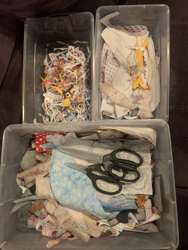 I had already started cutting pieces out at a meeting last week…and last night, with my brain racing, I stayed up too late to cut some more. This is about 3 1/2 hours of cutting…cut pieces on the top right, trash on the top left, what’s left in the bottom box.