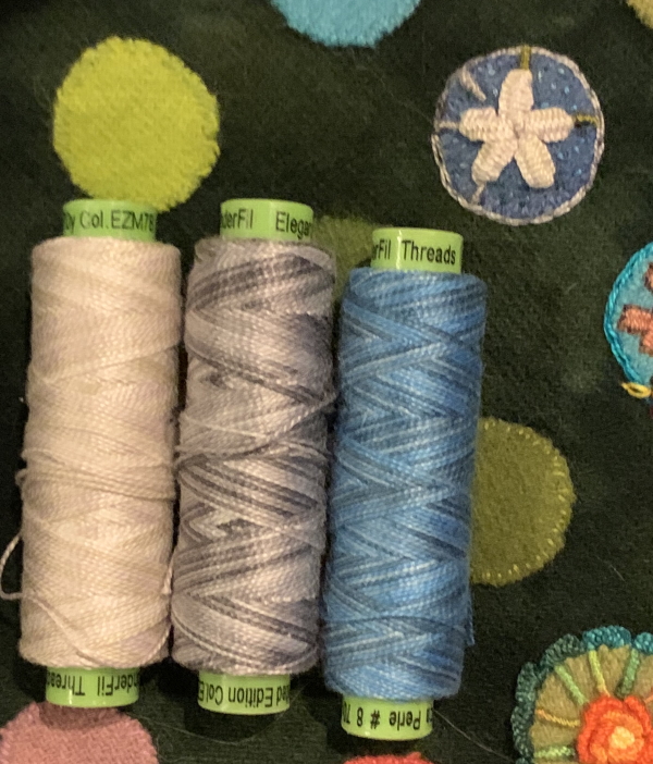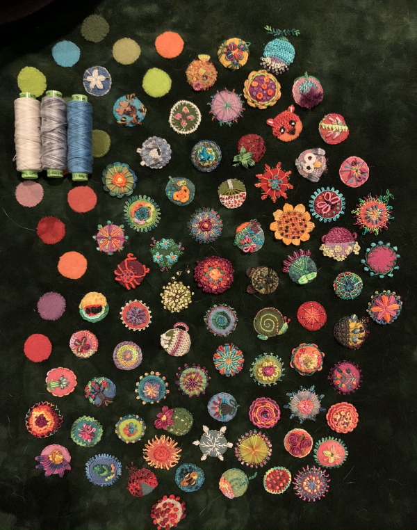 Dots! Almost done? Well…two weeks left at least. The flower to the right of the green spool.