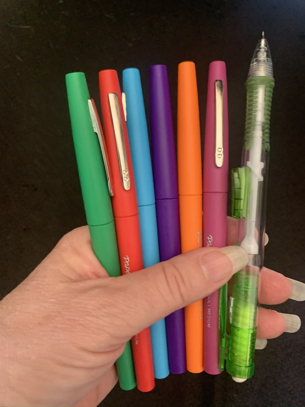 And here’s the pens I’ve been using to keep track of kids’ grades since we went out. Green is science, red is computers/PE, blue is math, purple is Advisory, orange is history, pink is English and pencil is you did it, but you’re not proficient (less than 70%).