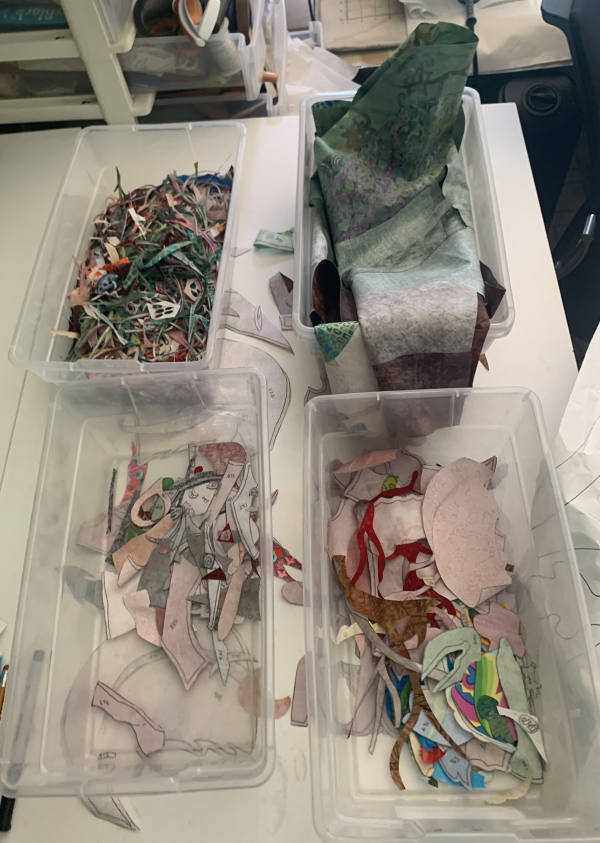 See? Wine. Goldfish were already eaten. So the trash is still lying around just in case, the top right box is the pieces I’ve ironed together already on the left and right of the large figure, ready to get ironed to her when she’s done. I have to cover all the laid-out pieces so cats won’t lie on them.