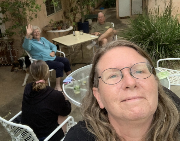 We are outside and 6 feet apart, although it’s hard to get everyone to remember to stay away or mask up. We are trying. Boychild is hiding behind me. We also had all the dogs together…my parents’ Katy or Katie or Katey. I just don’t know. She answers to all of them.
