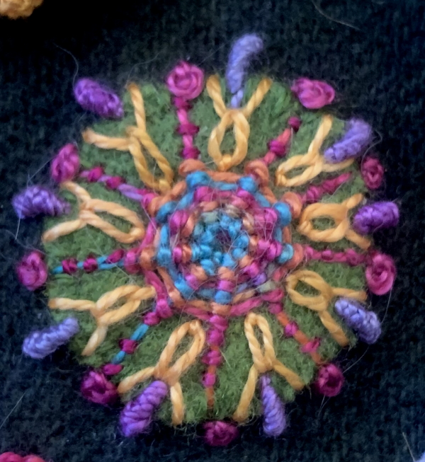 OK, so what else has been going on? Well, I finished the damn Sue Spargo dots…Saturday night, I stayed up and took about 4 hours to finish the two dots I hadn’t done and two more I added…the first one was the abstract next to the lion.