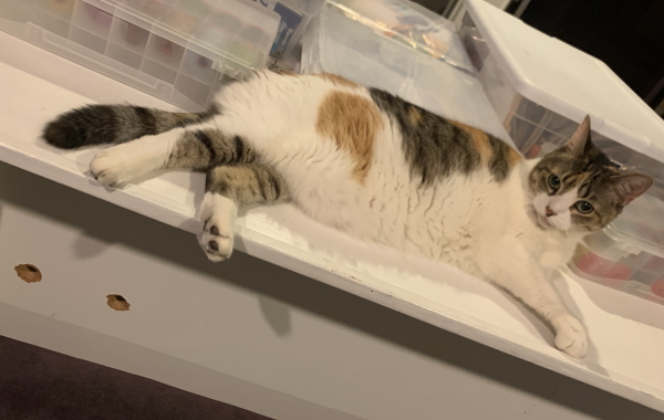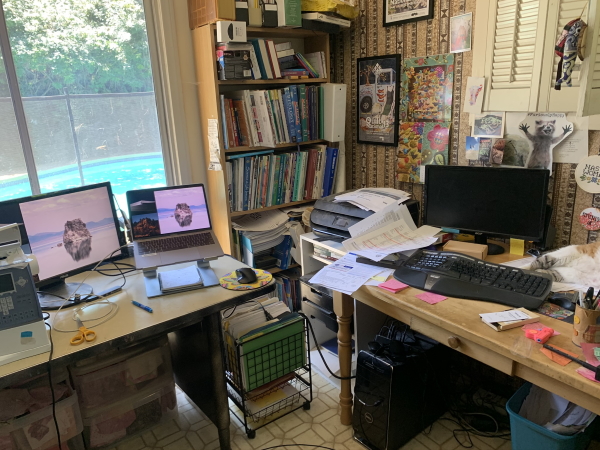 School laptop on a stand, wireless mouse, spare monitor hooked up to laptop, home computer on the side. Considering a board between the table (you can just see my sewing machine to the far left) and the printer shelf, just to move the mouse over. Might be useful. Now I can watch students AND run Zoom on the computer, and run something else on the other computer if I need to. Maybe Kitten will run that…