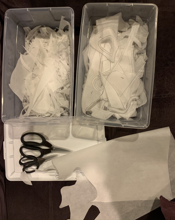 And I finished it all…so that means sorting tonight and hopefully starting to iron to fabric sometime soon. Which means putting a bunch of stuff away in the office/studio. Aargh. More cleaning. It took about 6 1/2 hours to cut out all the Wonder Under. The next step will probably take closer to 10 hours.