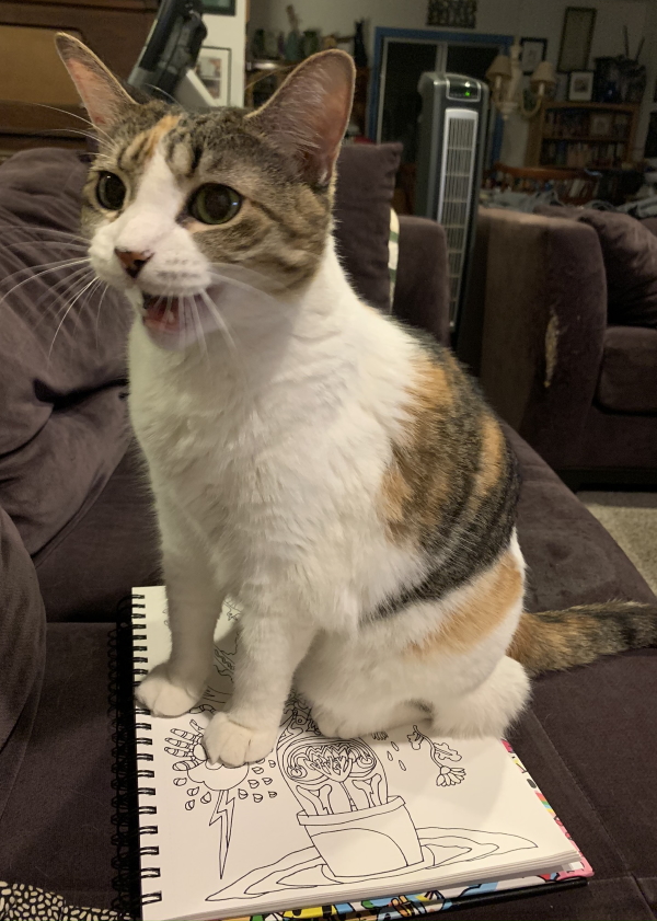 I needed to do a drawing for my Patreon last night, so eventually I gave up on working (it’s such a slog prepping shit because the curriculum is only half ready and I need slides, so right now I’m making them because theirs won’t be available until ‘mid-October’, whenever that is…too late, assholes). Simba helped for a while (fan blowing on both of us)…