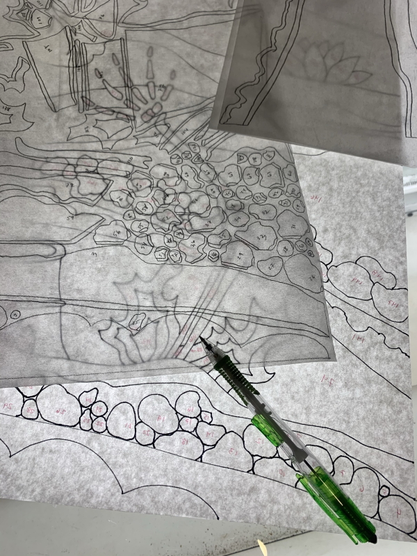 I’m glad I have Wonder Under meditation for this week. What is Wonder Under meditation? It’s when I get to trace 1185 pieces from my drawing onto Wonder Under…numbering each piece…and deciding what bits go under and adding an extra 1/8″ to that side. Last night, it was dirt and rocks. About a hundred rocks. What part goes under? This part. Or that part. Can I worry or even think about school when I’m doing that? I probably COULD, but I don’t. All I think about it “I’m drawing Piece 17. I’m drawing Piece 17. Piece 17 is under Piece 18. Add a sliver to go under. I’m drawing Piece 18. I’m drawing Piece 18.”