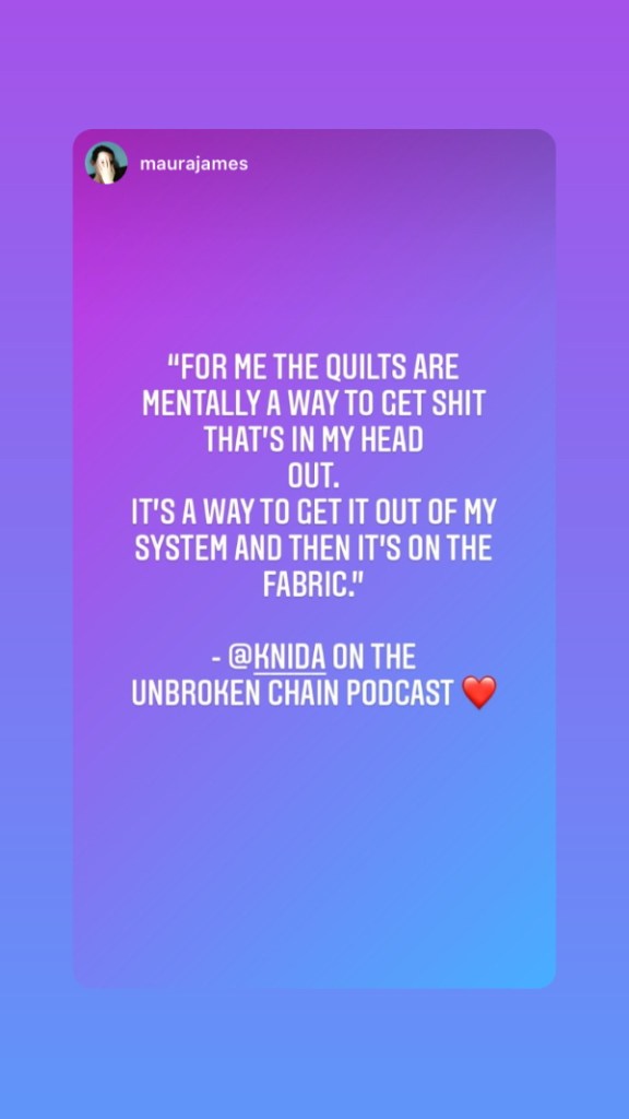 I appreciate her searching me out and caring enough to come up with good things to talk about. Certainly a lot of what I talked about is on my mind for the next quilt. So there’s that.