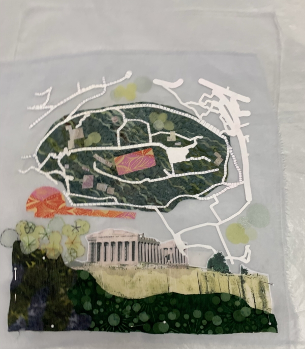 There’s the Acropolis. So I’m still working on this. I had to stop stitching because the paint needed to dry…