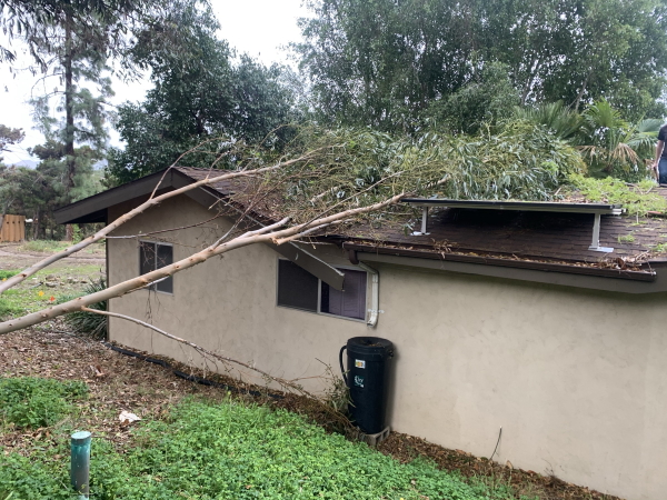 The sun is out again. I love that about mornings. I mean, I don’t, but I do. I love the bright blue sky and the ash tree that dropped a branch but has new growth peeking out. I love that there’s no wind today (yet?)…I love the wacky weather we get sometimes, but I don’t love what it does. I have a big old eucalyptus on my property. It was there before the houses were, easily. It’s got to be over 100 years old. I can’t put my arms around it. Three people could…maybe? I get it trimmed in the rotation. The trees I’ve trimmed so far this year were the ones who dropped the big-ass branches last winter. Then I ran out of money for that…the big old euc was on the next round, along with the three or four ash tress that are up on the slope. They definitely need it. So of course, in this last round of wind, hail, and rain, the big old euc dropped a large branch (could’ve been much larger!) on the roof, bringing down an ash branch with it.