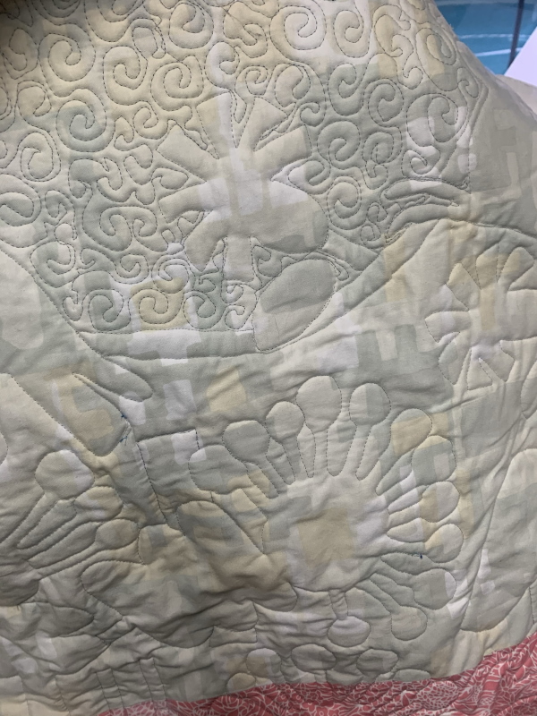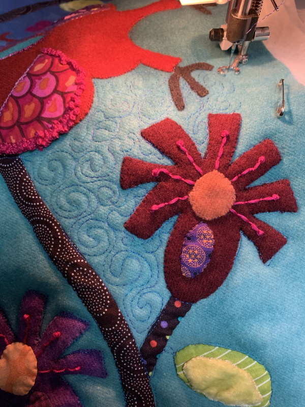 This is the first wool quilt I’ve ever quilted. I outlined everything so it would stand up, and then started quilting in the background.
