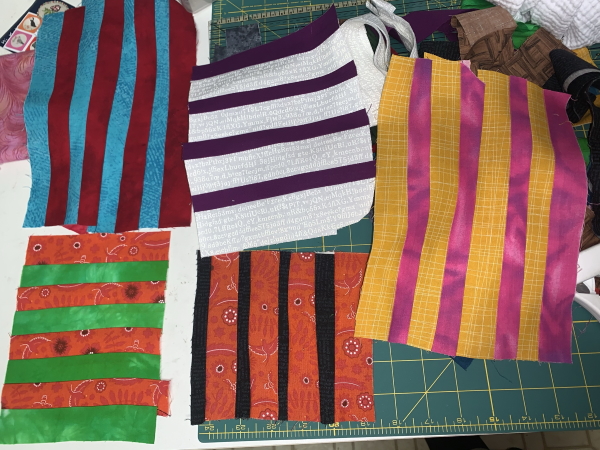 I took a class from Maria Shell. I’ve always been fascinated with the improv quilts that are mostly traditional patterns but not so traditional placement and colors. I can make a small one, I think. Maybe. Honestly, I’m having a hard time getting enough info from the videos in the time allotted. I have until tonight at midnight. I’m taking notes and there are handouts, but you know how that goes. If you’re in the class, physically (on Zoom or a classroom), you do the things right then and there. Watch a video? You’ll probably never finish. So we’ll see how it goes. I’m just making units right now. Freehand cut. Apparently I freehand cut pretty evenly. I had to work to get them uneven. Amusing.