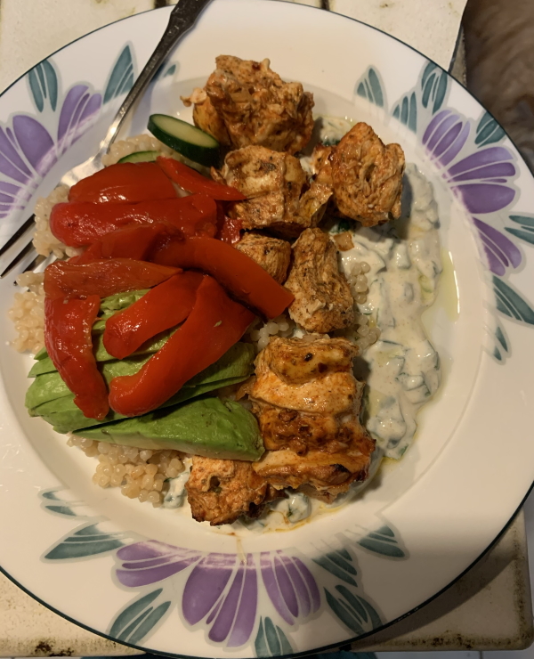 Dinner Monday night. Good food, but the recipe said 20-minute prep, and that was an hour.