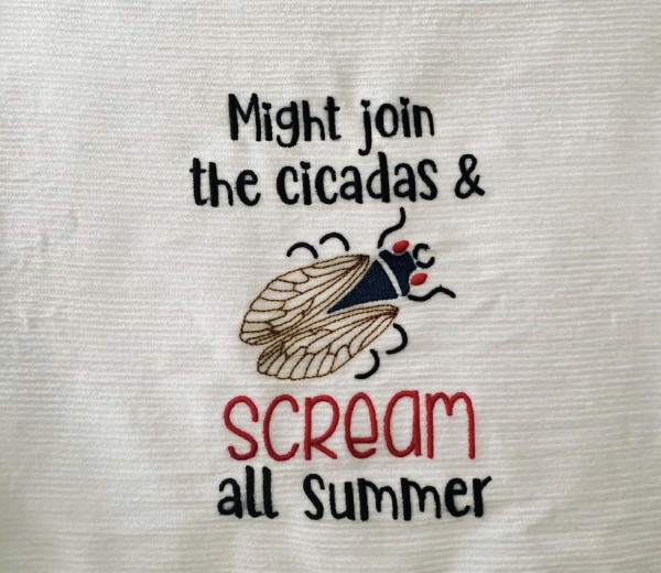 Someone I know was making tea towels for her mom…apparently the cicadas are coming back East? But this is kinda how I feel about the summer this year.