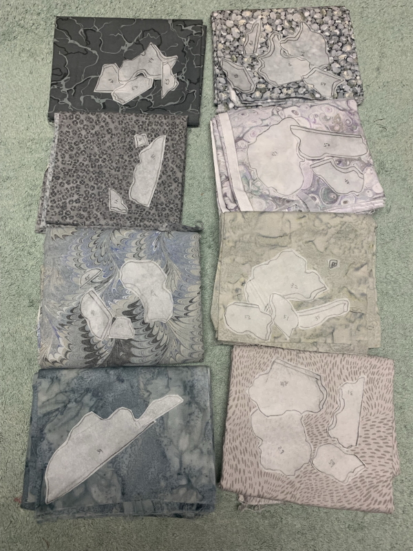 Meanwhile, I’m still working on the current quilt, although my brain kind of gets tied up in knots by it. Usually, let’s say I’m doing a dirt section that needs a run of 4 fabrics, light to dark…then I pick the 4 fabrics, lay them out, and put the pieces that will be ironed on each fabric on top of it, checking the drawing for what numbers go where. Cool, right? Easy peasy. But now I shoved the female figure in there. I want her to show up but not drastically. So I pick a second run of 4 fabrics that are similar but not the same, and then when I check the drawing for level 1 (the lightest), I have to do a second check on whether it’s the body or the ground. It looks like this…