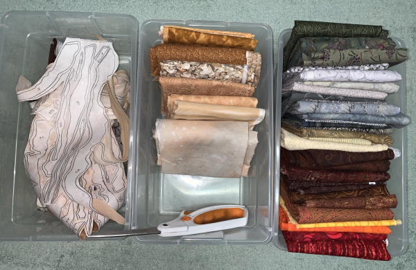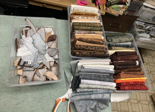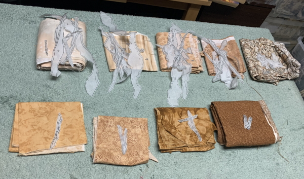 I honestly don’t know how it will turn out. I hope it will be OK. Hard to visualize though…even for me, and I do this all the time. At one point yesterday, I had a run of 6 fabrics twice, a total of 12, and was trying to find all the pieces from the 100s through the 400s that were part of that section…meanwhile, pulling out all the pieces that were a rattlesnake, a Garmin, or a couple of deer. Confusing as hell. While on two Zooms…at least those weren’t at the same time. So I still need to do the snake, the Garmin, and the deer, plus a bushy stripe that went through the dirt areas, and then some water in the middle of it. It’s not going quickly, but the day is.