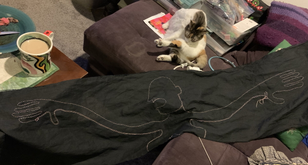Kitten for sizing. So this is going to be covered in stitching, mostly running stitch. I wanted to get the outline in so I could start adding parts, like veins and a heart and fingernails and lungs if I decide to do that. I have no idea what’s going to be going on around her, but it will be cool. Now that there’s an outline, I don’t need to mark things…I think. Makes it easier. OK, maybe need to mark the heart and the eyeball…and the hair? I don’t know…we’ll see. Fun stuff. Great way to use up all the thread I have…except you know it won’t use ALL of it up. This is almost all of one card of perle cotton. I’ve got about a million more.